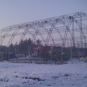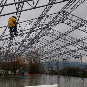 • Acoperirea structurii se realizează prin tensionarea și fixarea prelatei pe structura metalică cu ajutorul pop-niturilor. Aceasta metoda de fixare permite tensionarea la maxim al membranei de prelata, crescand astfel rezistenta structurala, imbunatateste estetica constructiei si scade sansele de formare ale acumularilor de zapada/apa pe invelitoare.