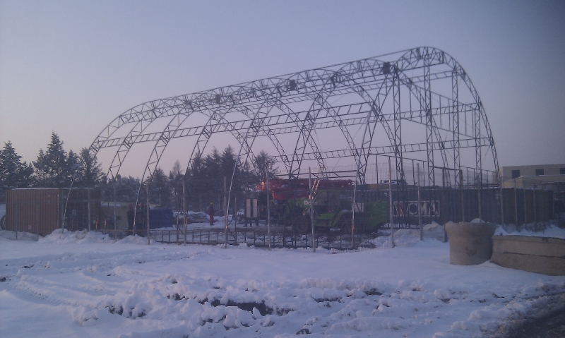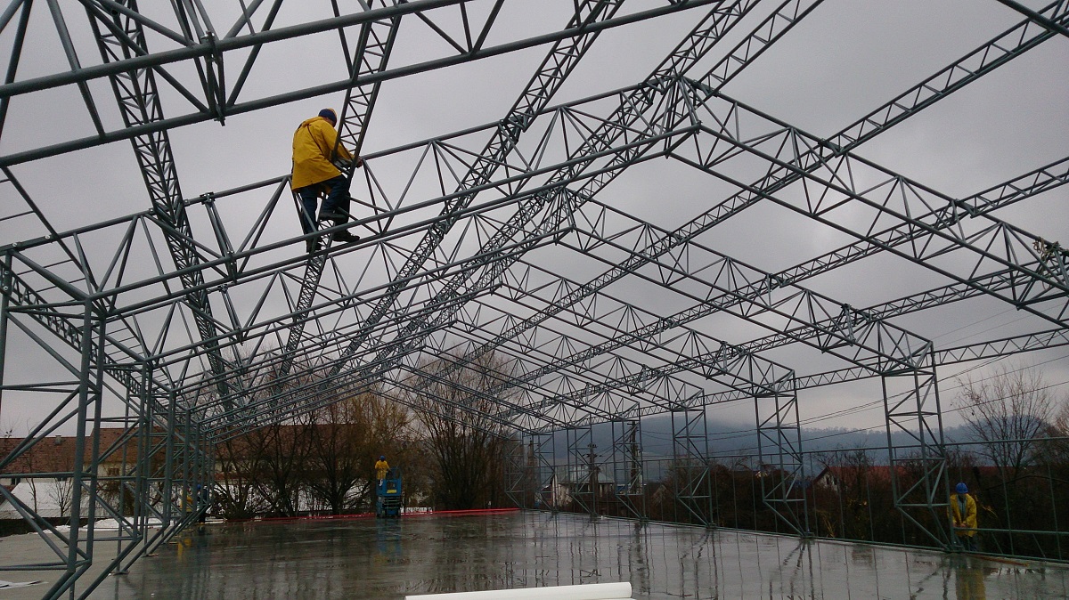 • Acoperirea structurii se realizează prin tensionarea și fixarea prelatei pe structura metalică cu ajutorul pop-niturilor. Aceasta metoda de fixare permite tensionarea la maxim al membranei de prelata, crescand astfel rezistenta structurala, imbunatateste estetica constructiei si scade sansele de formare ale acumularilor de zapada/apa pe invelitoare.